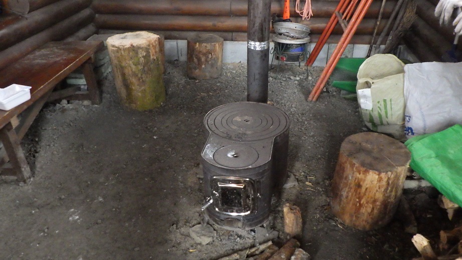 小屋の中はよく掃除されていて 薪ストーブは時計型のものだ。 |