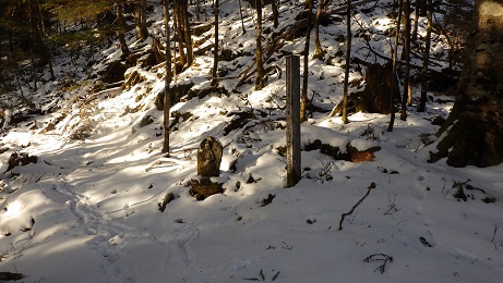 甲武信岳方面は人の足跡があったが、 十文字峠方面は獣の足跡だけだった。 |
