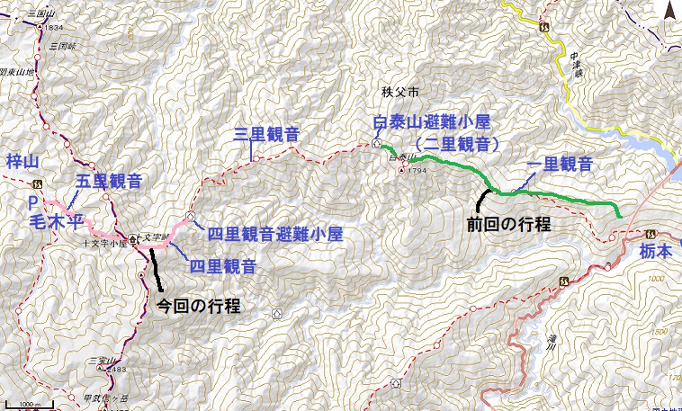 前回栃本から四里観音避難小屋まで往復するつもりだったが、二里観音のある白泰山避難小屋までしか行けなかったので、