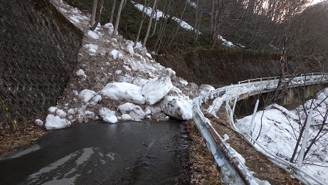 歩き始めてすぐに、車道が雪崩で埋まっていた。 ここは翌日帰る時にはきれいにかたずけられていた。 |