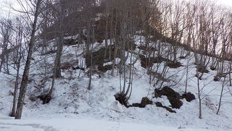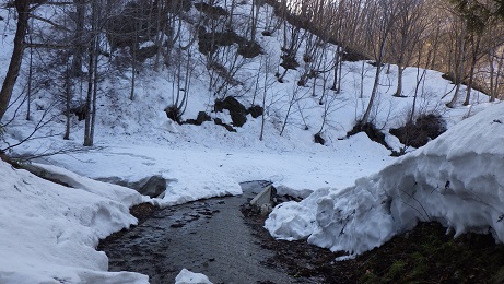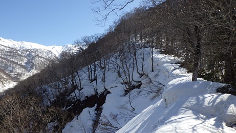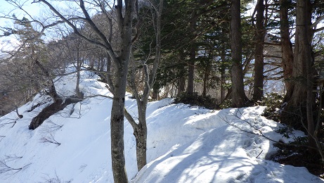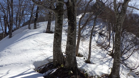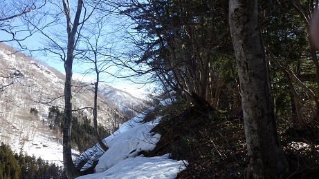 尾根末端は半分くらい雪が溶けて、地肌が露出していた。 まだ3月だというのに、気温が上昇するのが早かったか。 前回は藪漕ぎを嫌って、少し上流で斜面をのぼったが、 今回は正式のルートを取ることにして、藪漕ぎも厭わないことにした。 |