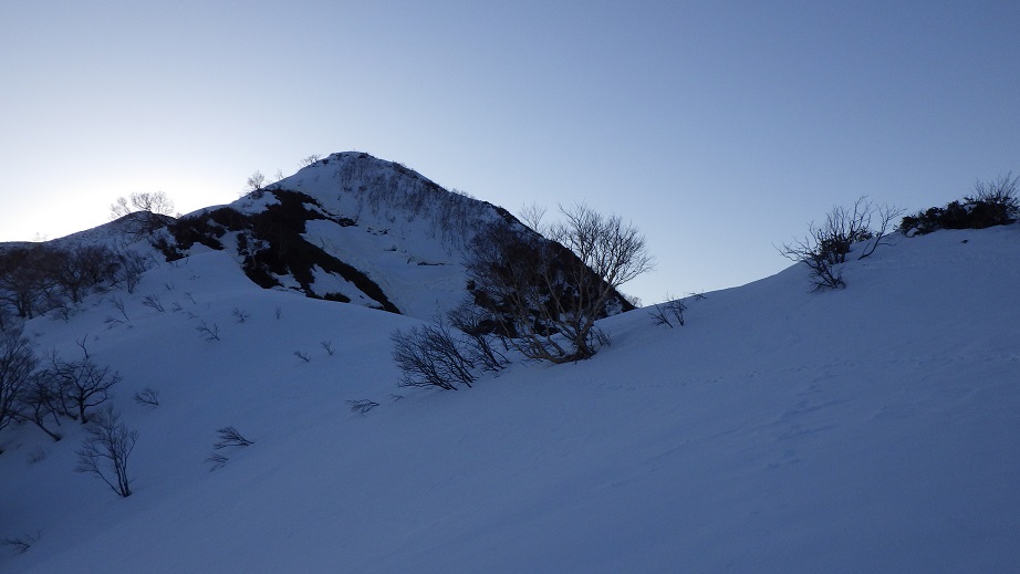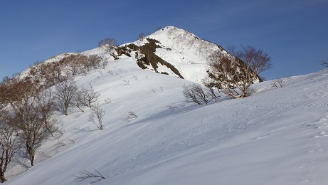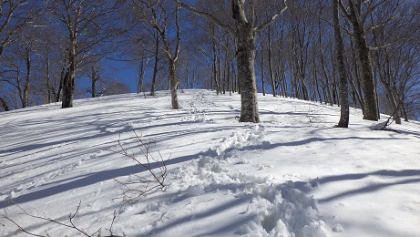 | 段々雪がつづくようになり、トレースもしっかりあった。このトレースが上まで続いていてくれれば、登頂できるだろうと思った。 | |