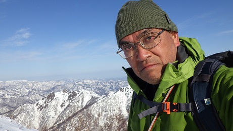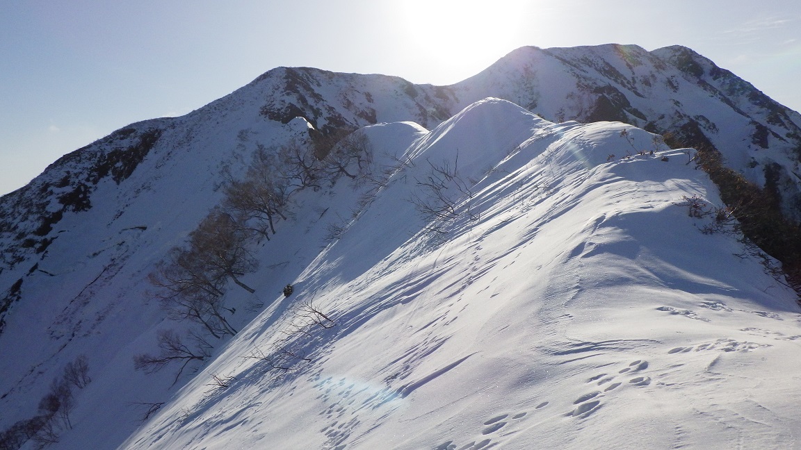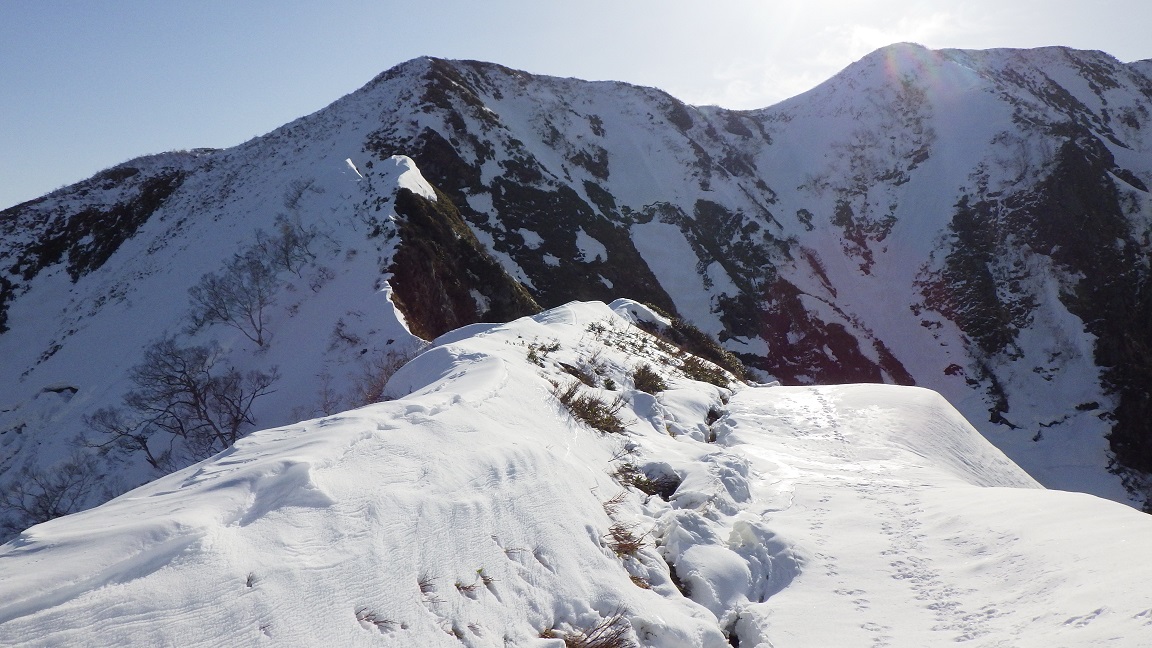 | ナイフリッジの雪の状態がどんな風か、気になっていたが、雪は柔らかく、靴底が決まらず、脛程度まで潜る感じだった。 足が深みにはまりバランスを崩すと滑落の恐れがあると思い、慎重に一歩一歩前進した。 国境稜線の手前で雪が不連続になり、前進が困難と思える部分があったので、 これ以上の危険を冒すことはやめて、また、引き返すことにした。 |