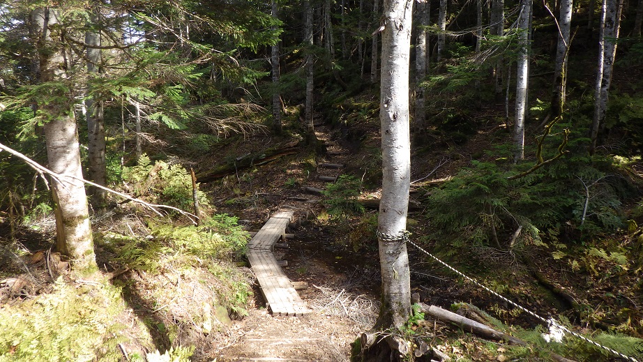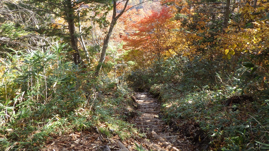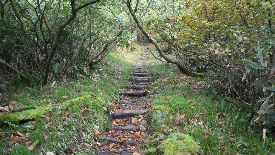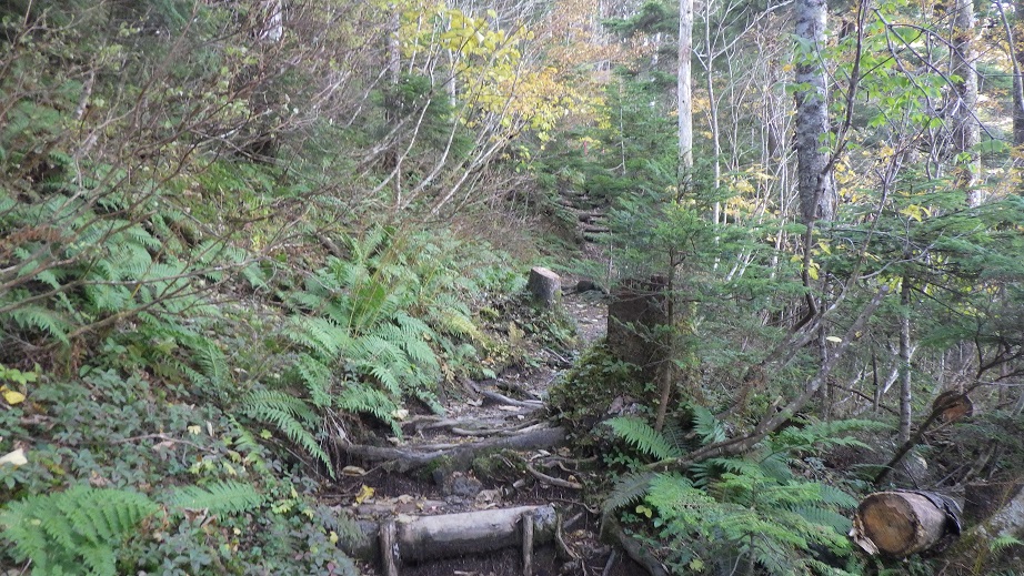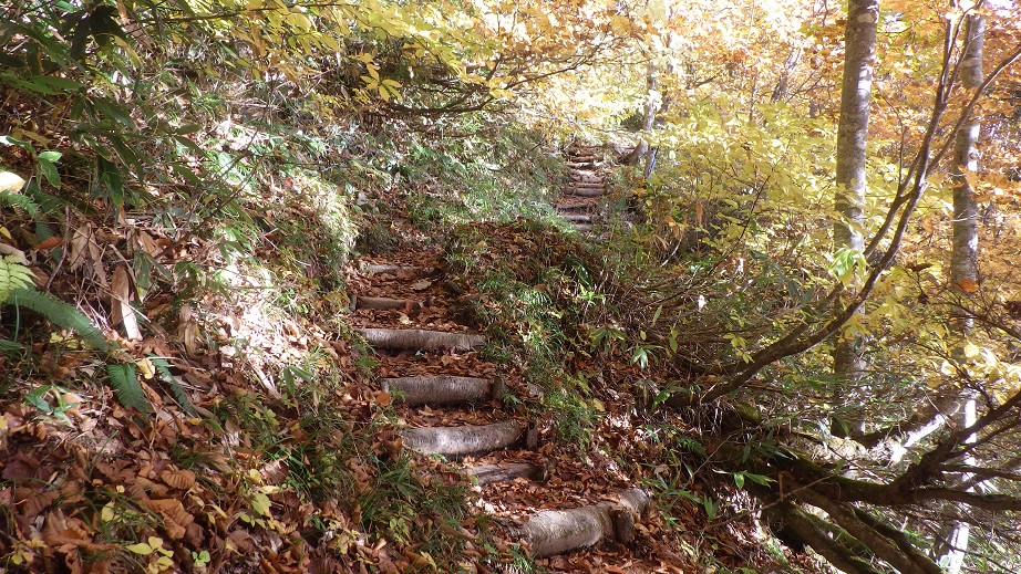 登山道は木の階段がよく整えられていて歩きやすい。 このあたりもクマが多いらしいので、くますずを鳴らしながらあるいた。 |