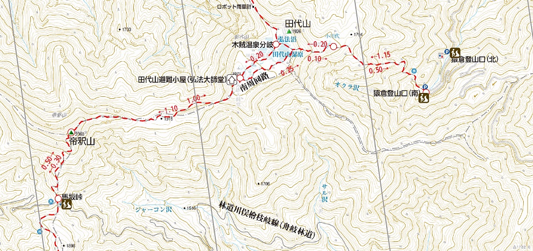 登山口は標高1430m 小田代は1810m 田代山は1971m 帝釈山は2060m 田代山と帝釈山の間の最低鞍部は1890mである。 登山口と帝釈山の標高差は630mだが、累積では 540+40+160+40+80=860mくらいになる |