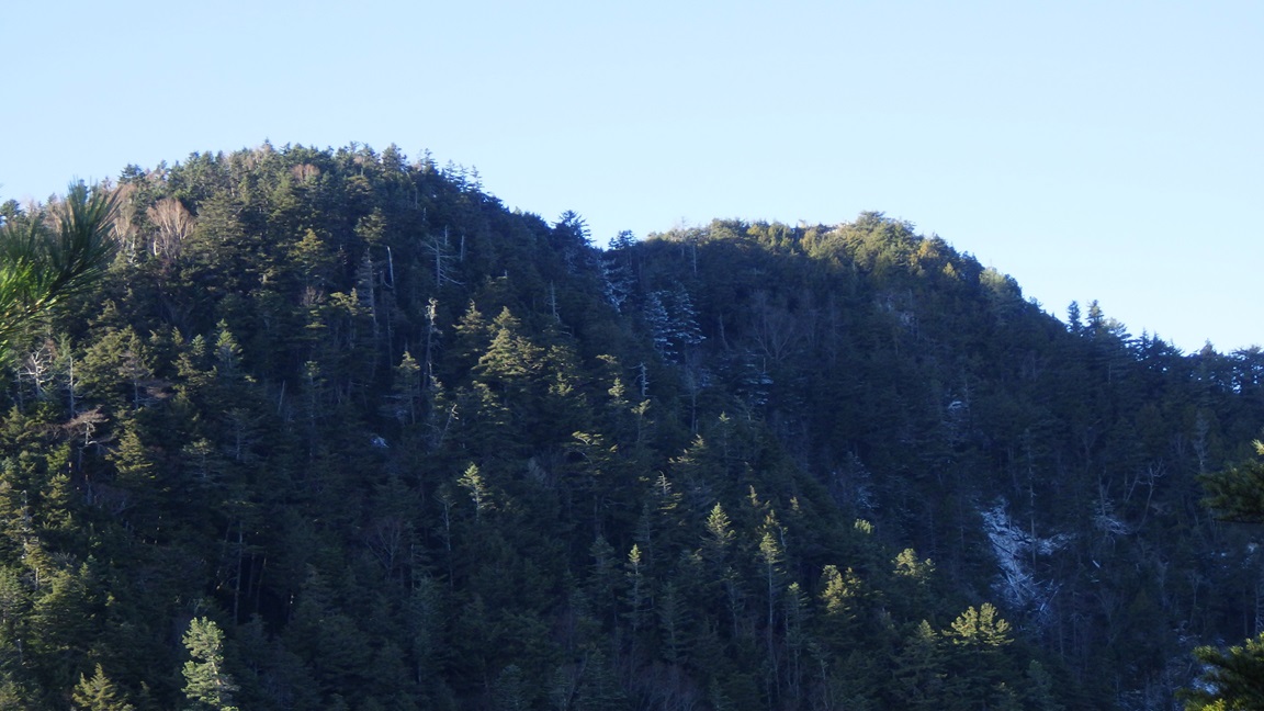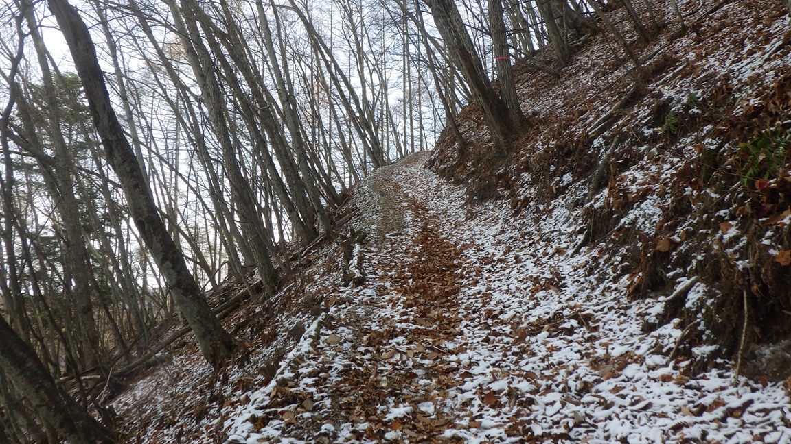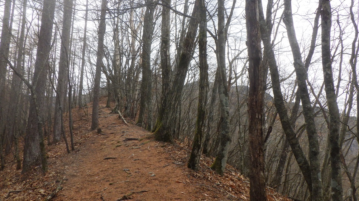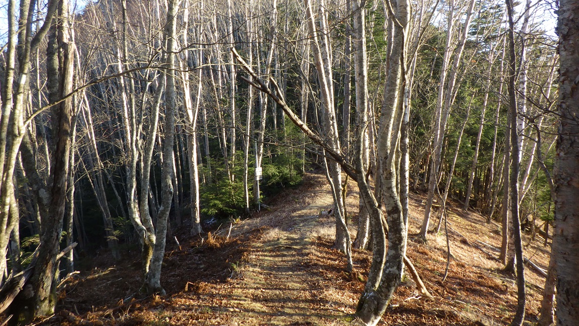 御座山を振り返りみる。 肉眼では頂上の標識があるような気がしたが、写真には写っていなかった。 下山途中、8時過ぎに3組4人の登山者とすれ違った。 昨日より天気が良い為か、皆、6時頃出発しているのだろう。 |