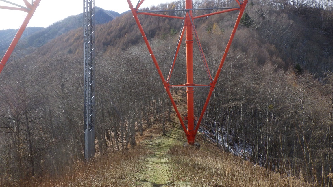 | 1630mくらいまで登ると40mくらい下りがあって、巨大な鉄塔がある。 10:40 | 鉄塔をくぐってもまだ少しくだる。下る。 |