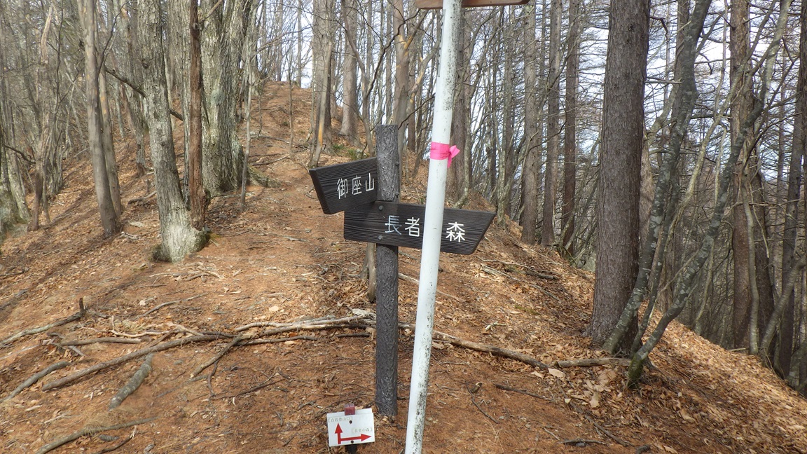 前衛峰と御座山とのコル 地図には書かれていないが、看板には右の谷筋からも道があったように記されていた。 13:00 |