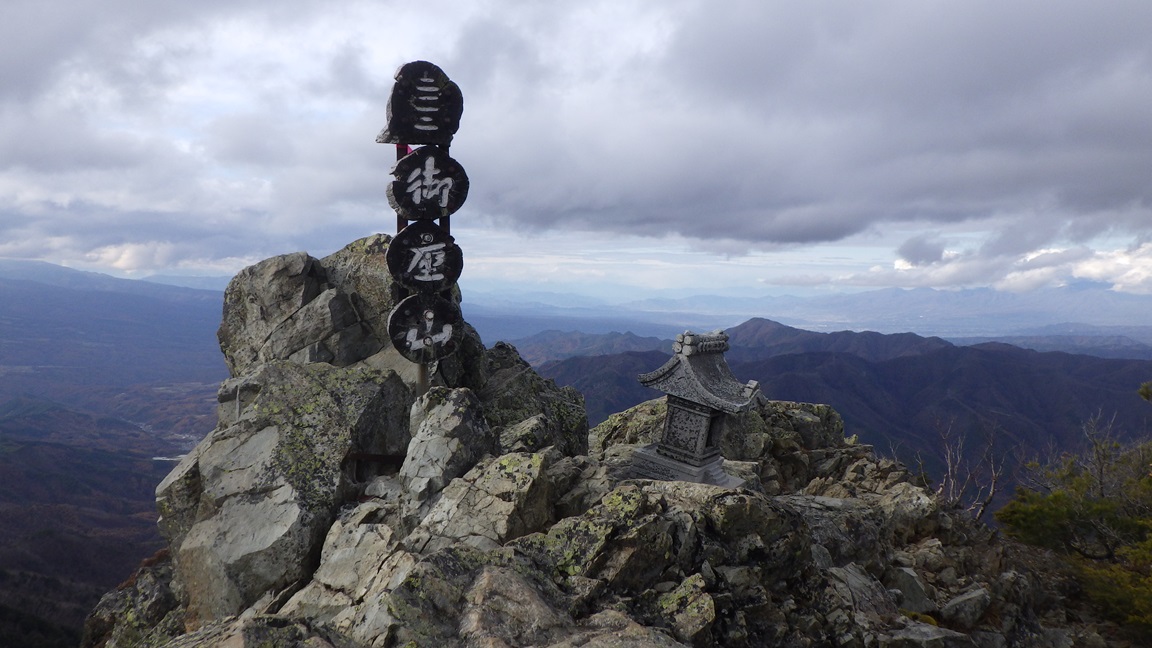 頂上は小屋からすぐだった。 岩場を慎重に進むと標識と祠があった。 14:06 |