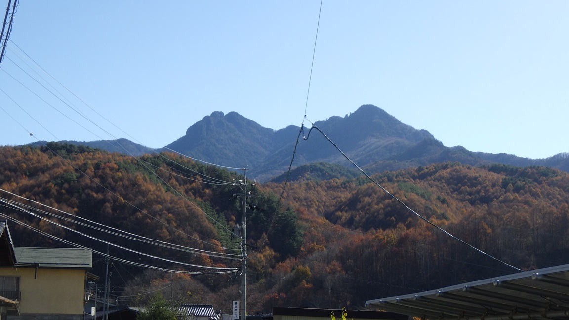 帰り道で御座山が見えるところを探したが、電線が邪魔をしている構図になってしまった。 山頂付近は岩場だったので、左のピークが御座山だろう。 |