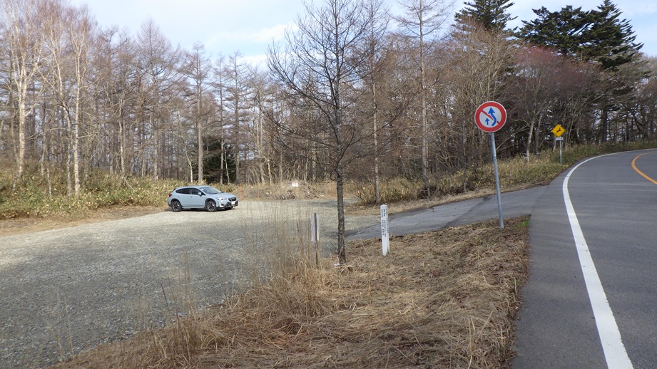 登山口の道路の反対側に広い駐車場がある。 20台くらいとめられるのではないか。 7:10に出発した。 チェーンスパイクと軽アイゼン ストックとピッケルを持った。 |