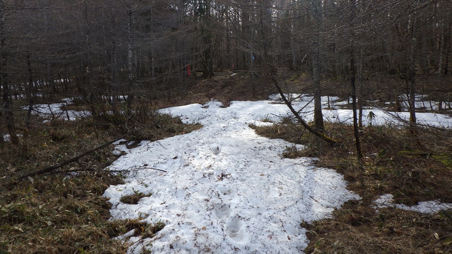 大沼の分岐を超え雪面を歩いていく。 だいたい良く締まっているが、 ときどきズボッとはまる。 |