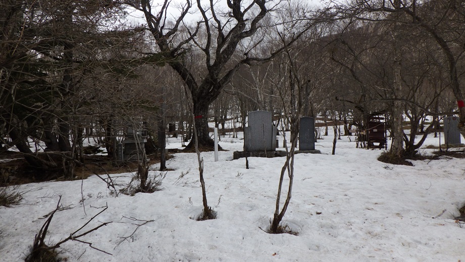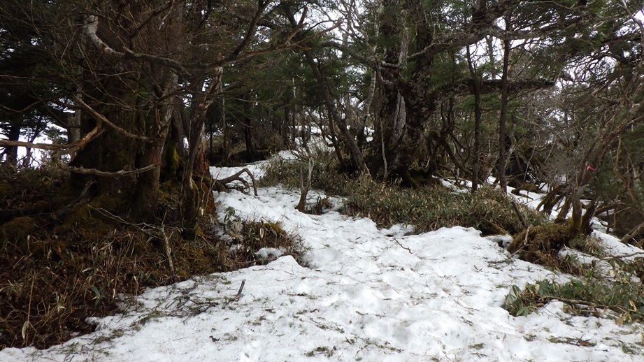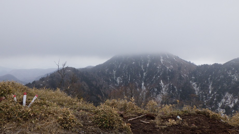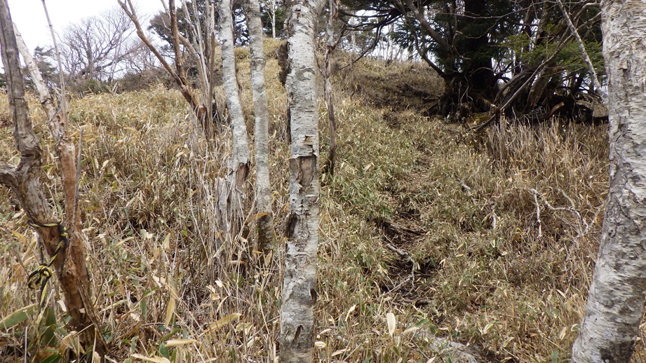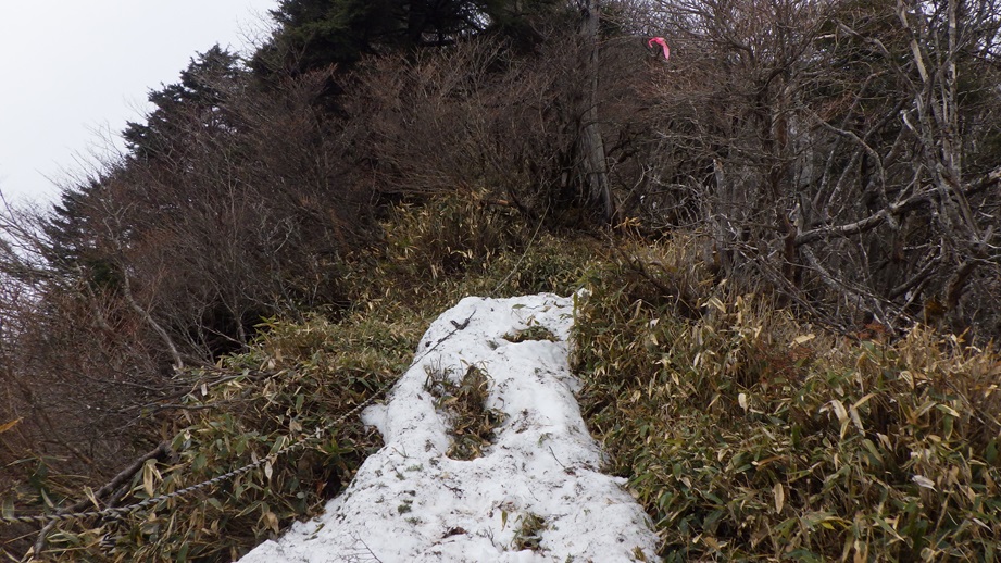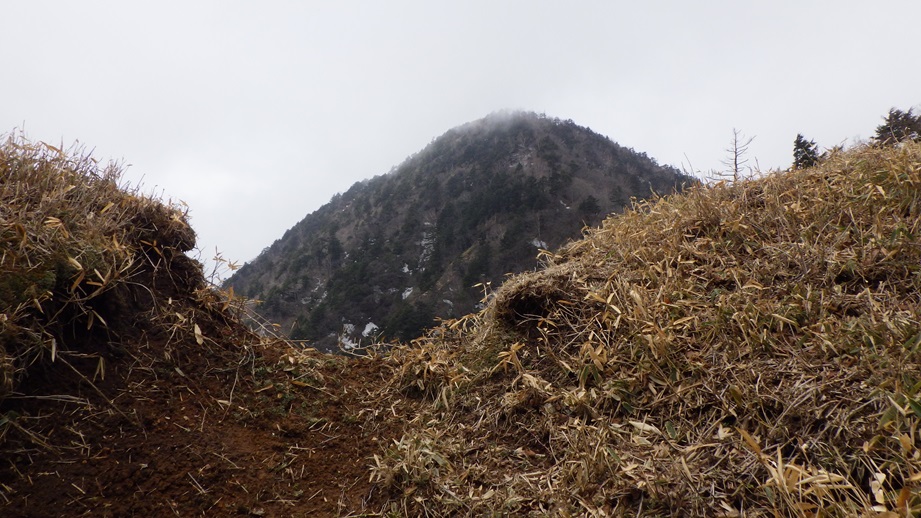 鶏頂山と釈迦が岳の間のコル 向こうに見えるのが鶏頂山。 コルへ上がる手前で降りてくる登山者に会った。 私とは違うところに車をとめて、6時頃出て、 鶏頂山寄りの登路を登ったそうだ。 頂上付近は凍結しているところがあるから チェーンスパイクをつけていったほうが良いと 言っていた。 |