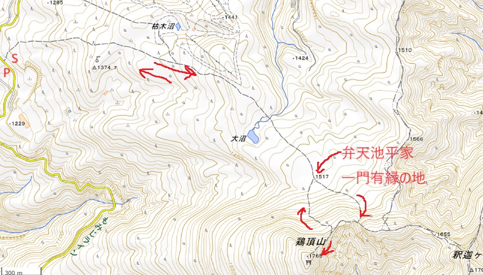 1517m地点に ”弁天池平家一門有縁の地”という碑や 祠や鳥居のあるところにでる。 |