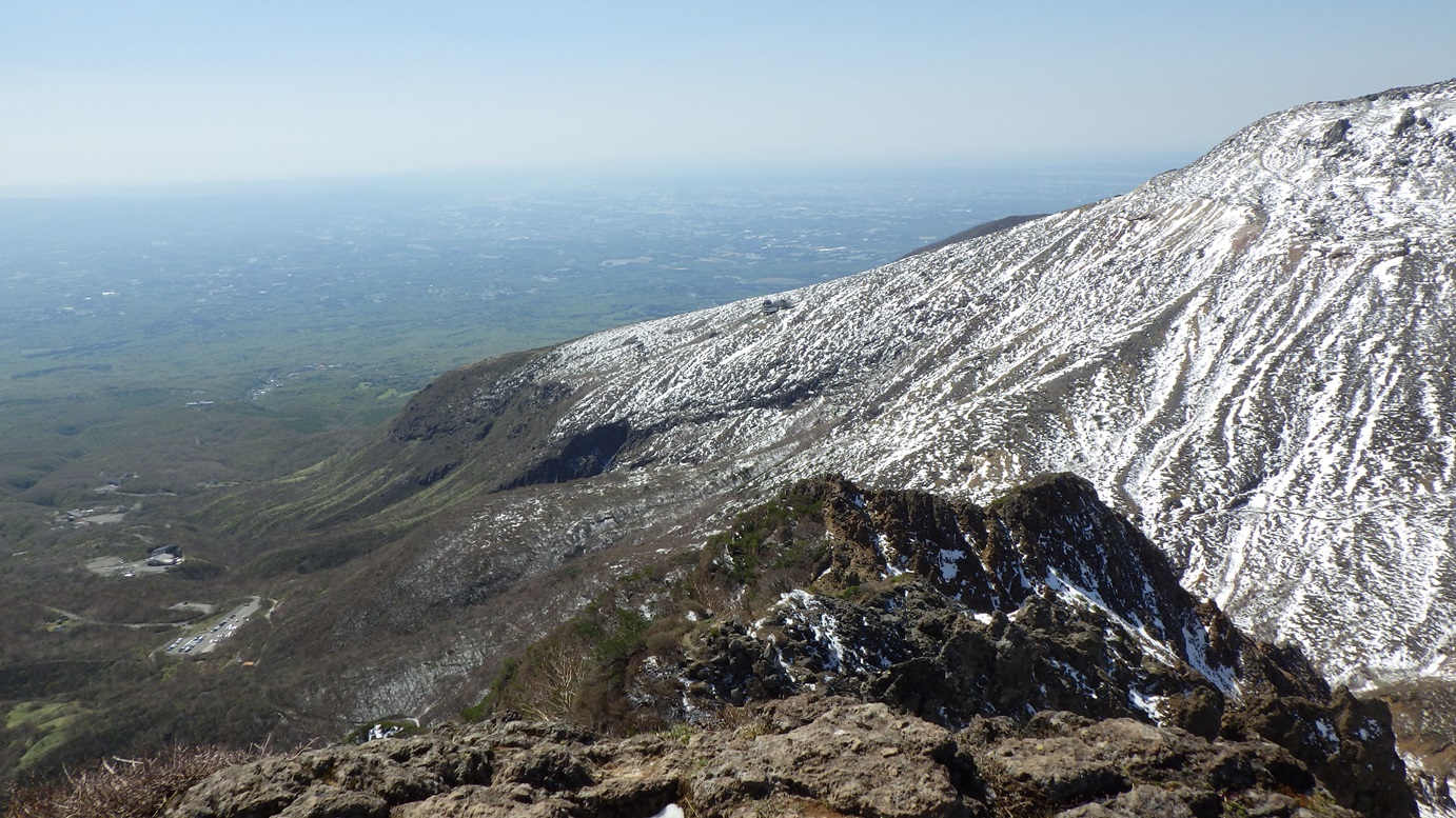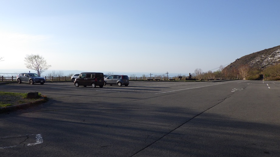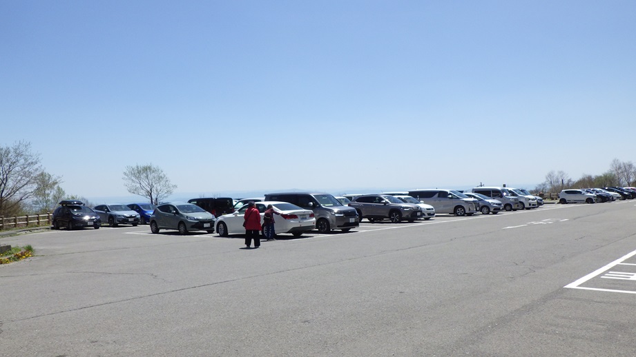朝日岳頂上からの眺め 拡大すると左下に駐車場が見える |