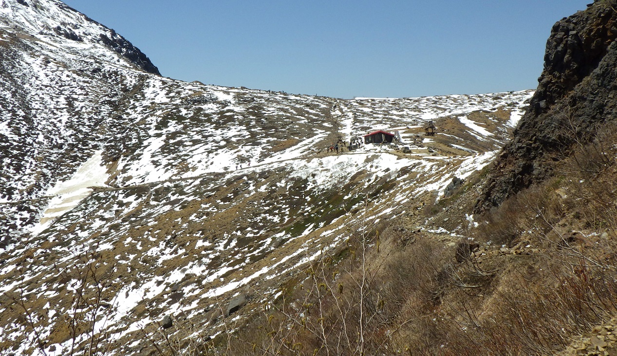 10:30頃 避難小屋のところに大勢の登山者が見える 平日なのにこの混雑はどうしたことかと思ったが 百名山に挙げられているためか |