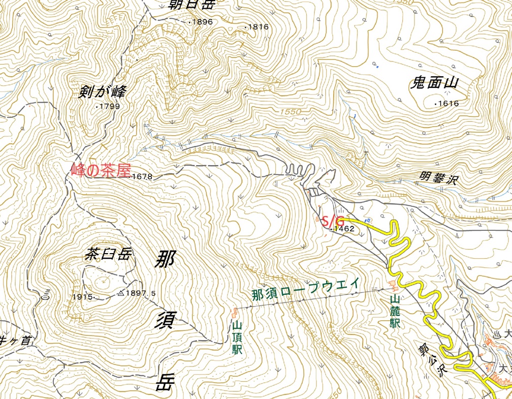 那須ロープウェイ山麓駅の上にある 峠の茶屋駐車場から登ることにした。 駐車場の標高が1460m、 峰の茶屋跡が1720m、 茶臼岳が1915m 朝日岳は1896mだ。 まず茶臼岳に登り、余力があれば 朝日岳にも登りたいと思った。 |
