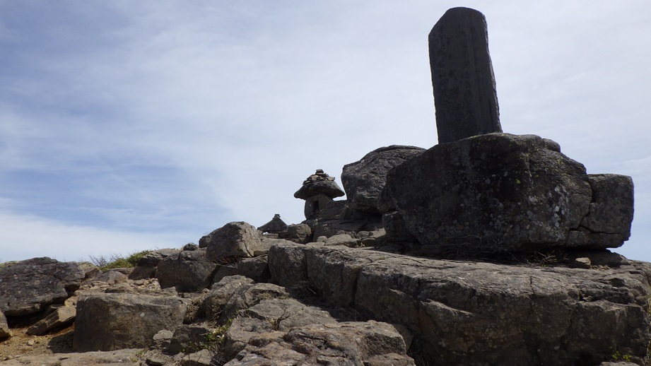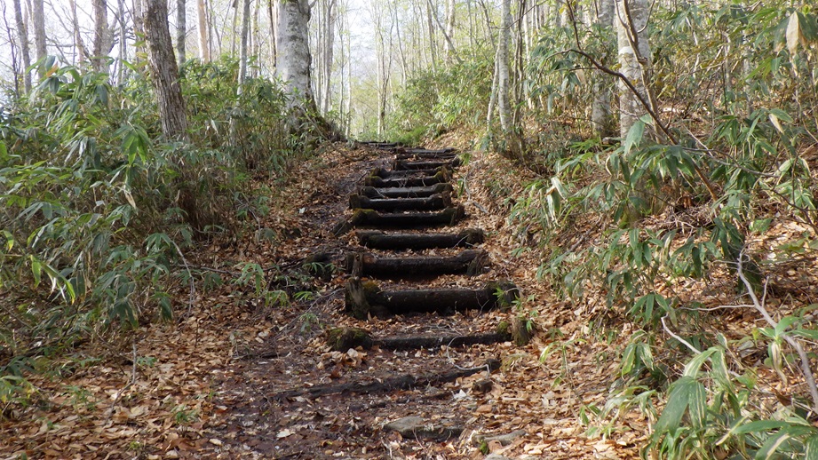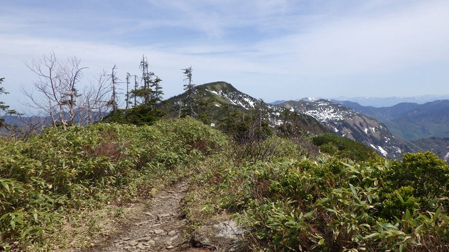 裏岩菅山 こちらの方が46m高い。 私より先に出発した人に岩菅山の頂上近くで会ったが、裏岩菅山にも登ってきたと言っていた。 私は体力的にそんな余裕は無いと思った。 10:15頃下山を開始。 途中で3人の登山者とすれ違った。平日なのに登山者が多く、割と有名な山だなと思った。 下りでは残雪のトラバースの部分でチェーンスパイクを着けた 12;40頃車に戻った。このころから曇ってきた。 |