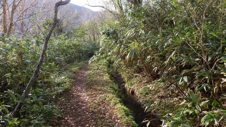 標高差で70m程登ると、用水路沿いに作られた道にでる。 この用水路は何の目的で作られたものだか分からなかったが、 地理院地図には上条用水路とかかれており、底清水という看板のあるところもあった。 水源地区立ち入り禁止という看板が3つくらいあった。 あとで調べてみると、幕末から明治にかけて作られた農業用水路で全長23キロもあるらしい。 |