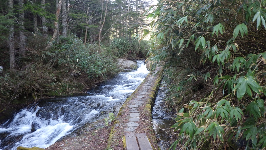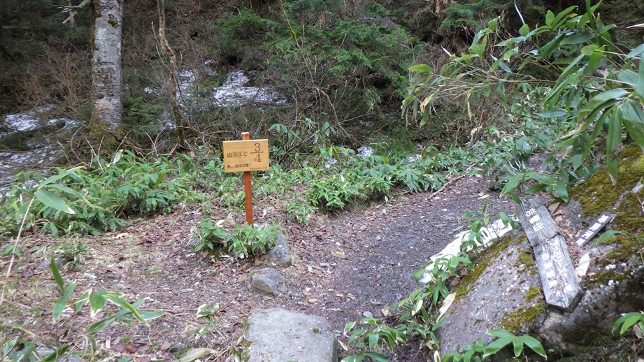 アライタ沢をわたる橋を渡ったところに3/4という看板があり、1/4の行程が過ぎたことを示している。 この橋の手前に枝沢を超える橋がもう一つあった。 |