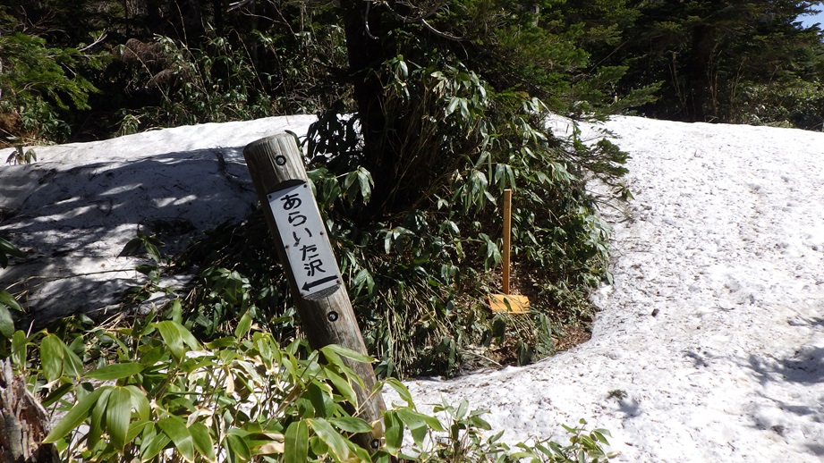 | 2070mで稜線上の道と合流すす部分には、アライタ沢を示す標柱があった。 | |