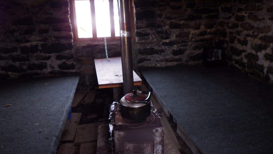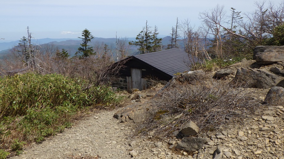 | 頂上近くに避難小屋がある。 トイレは持参したポータブルトイレを使用するための場所として作り変えられていた。 |