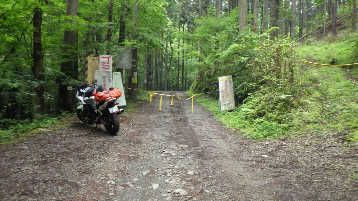 |  | 千葉の自宅を朝5時頃出発し、中央道上野原ICでおり、 上野原あきるの線と、檜原街道を通って笹平のバス停 のところから林道に入った。 林道に入って500メートルくらいのところにロープが張ってあり 関係車両以外通行禁止と書かれていた。 ロープは簡単に外せる状態だったが、ここにバイクを乗り捨てて 歩くことにした。 7:25バイクを降り、身支度をして7:50歩き始めた。 |
