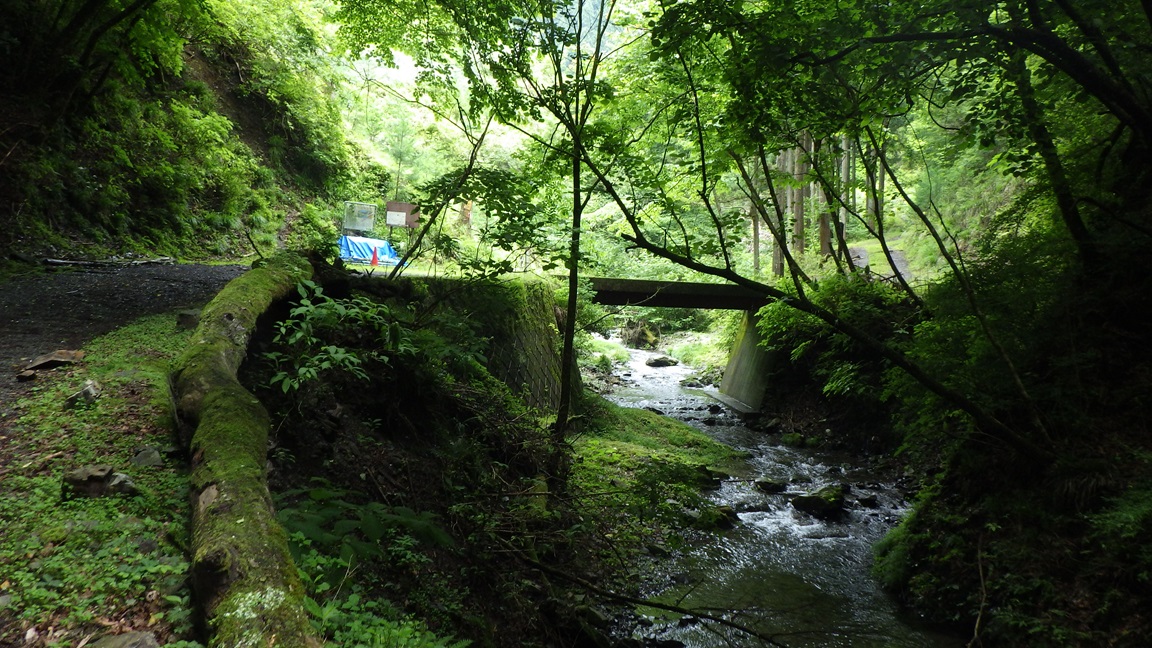 沢登をする場合は、林道が沢から離れる手前の橋の部分が入渓点となり、ここまで車が入れると書いてあるものもあったが