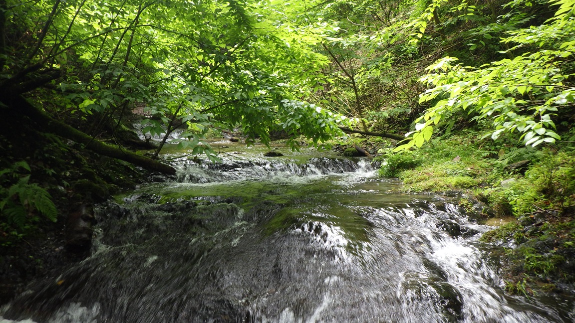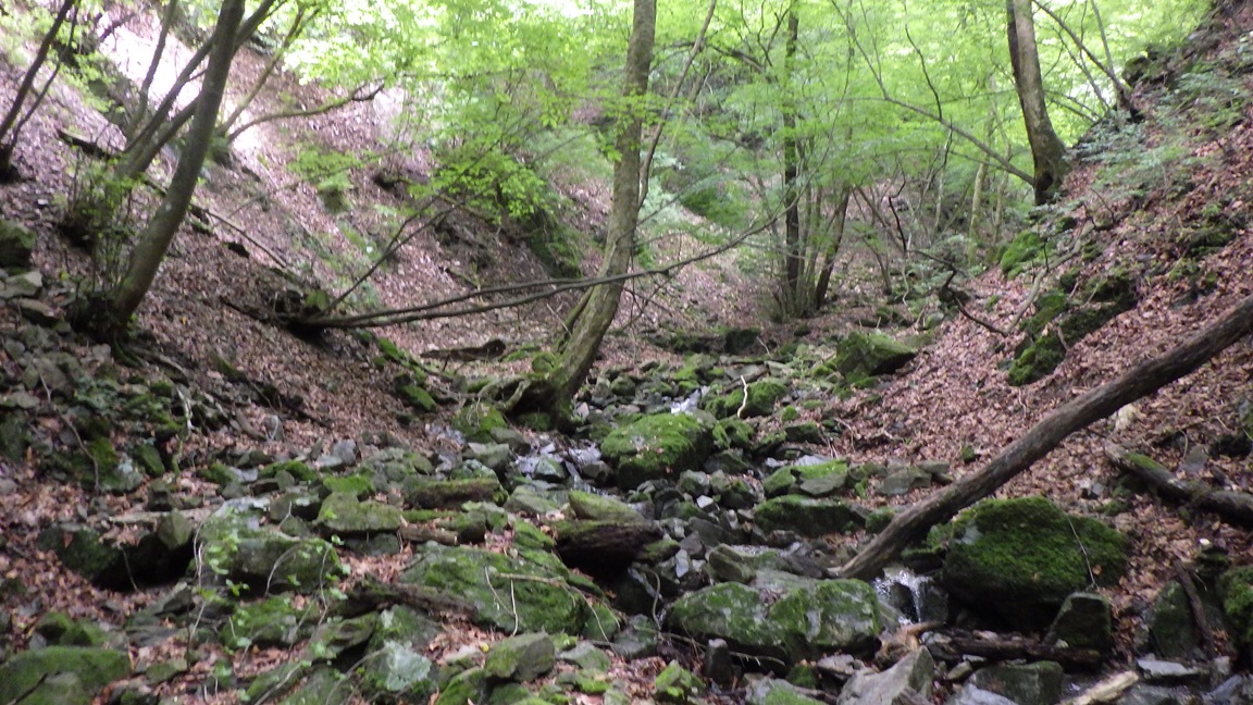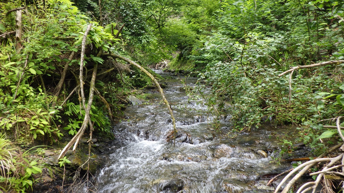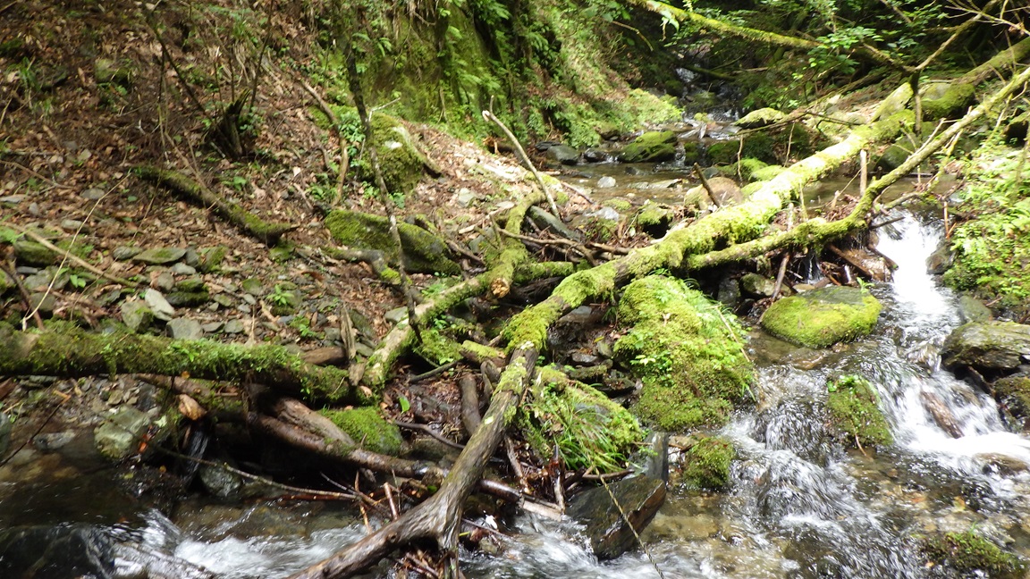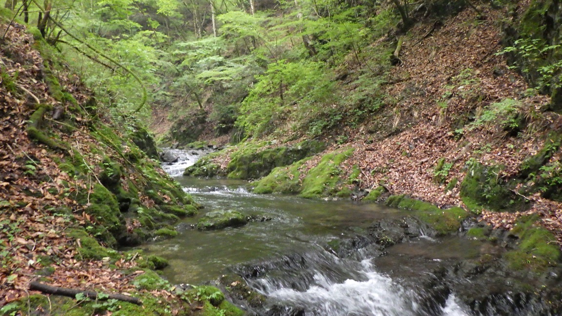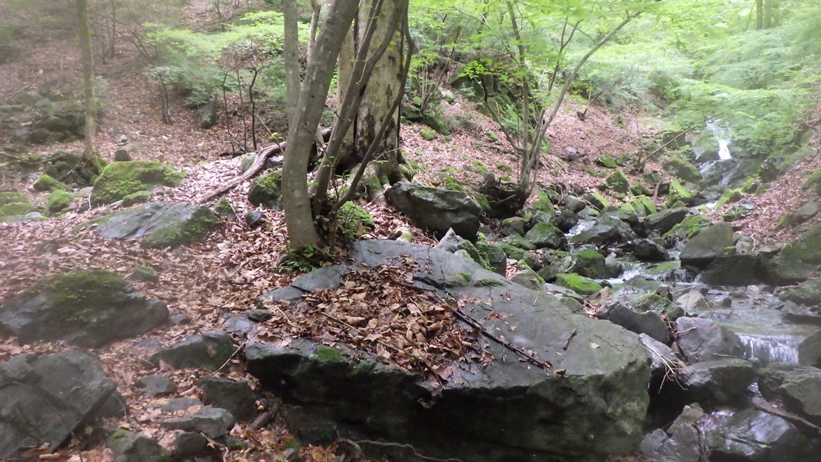 |  | 開けた二股 12:05 ここまでだいぶ時間がかかった。 標高差は入渓地点から200mくらいしかないが、 水平距離は2kmくらいあり、3時間くらいかかった。 ここは右へ進む。 ひろたたけしさんは右股を登り左股をくだったそうだ。 |