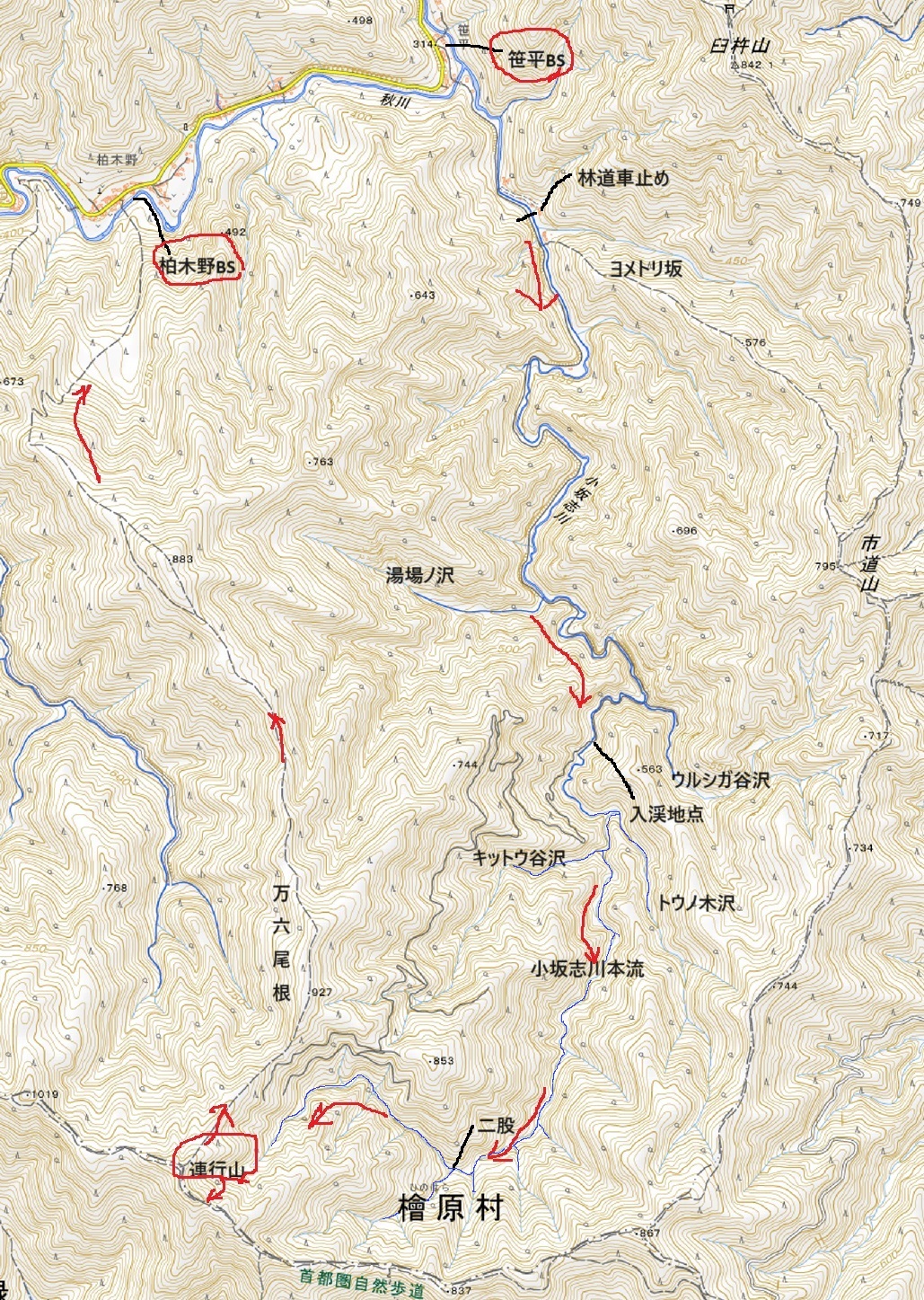 小坂志川を源流まで登ると、万六尾根を降りて柏木野バス停へおり、1.5km離れた笹平バス停まで歩くことになるので、