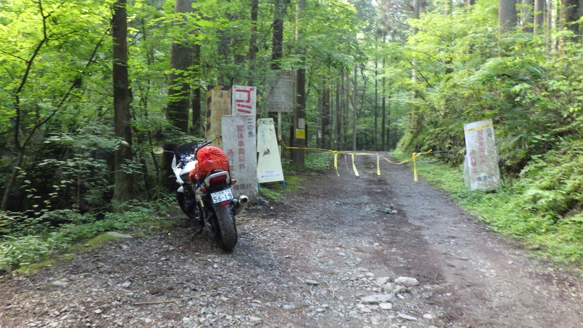 前回と同じ車止めの前にバイクを止めた。 バス停から約800mだ。 沢支度をして 7:10 林道を歩き始めた |
