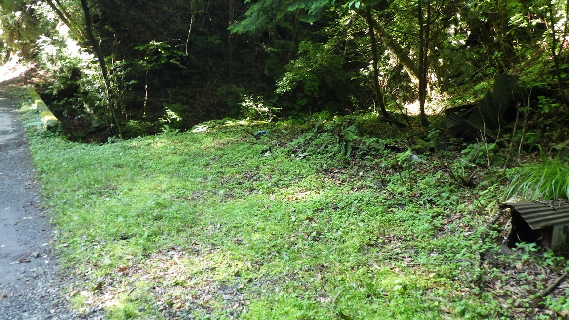 7:40 バイクから30分ほど歩いて湯場ノ沢にかかる橋に着いた。 橋の手前右側にトタン屋根の残骸がある。 湯場ノ沢の右岸から降りる。 |
