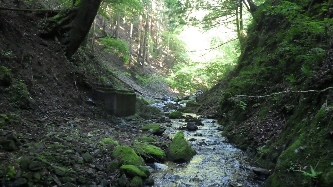入渓地点の近くにコンクリート造りの箱状のものがある。 その昔、鉱泉が湧いていたころの風呂桶だったらしい。 |