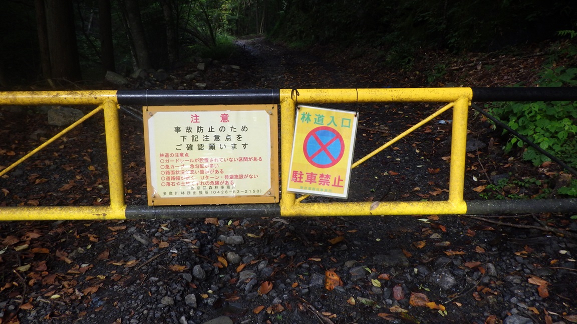 2024/9/6 自宅を朝4:30に出た。 自宅からは140kmくらいしかないが、 奥多摩のエリアは高速道路の出口からの距離が長いので 3時間くらいかかる。 この日は中央道の八王子から八王子JCTあたりが通行止めになっていて カーナビでは関越道経由圏央道周りで誘導された。 林道ゲートは写真のような看板がついているが、通行止めではないらしい。 ゲートは開けることができる。 |