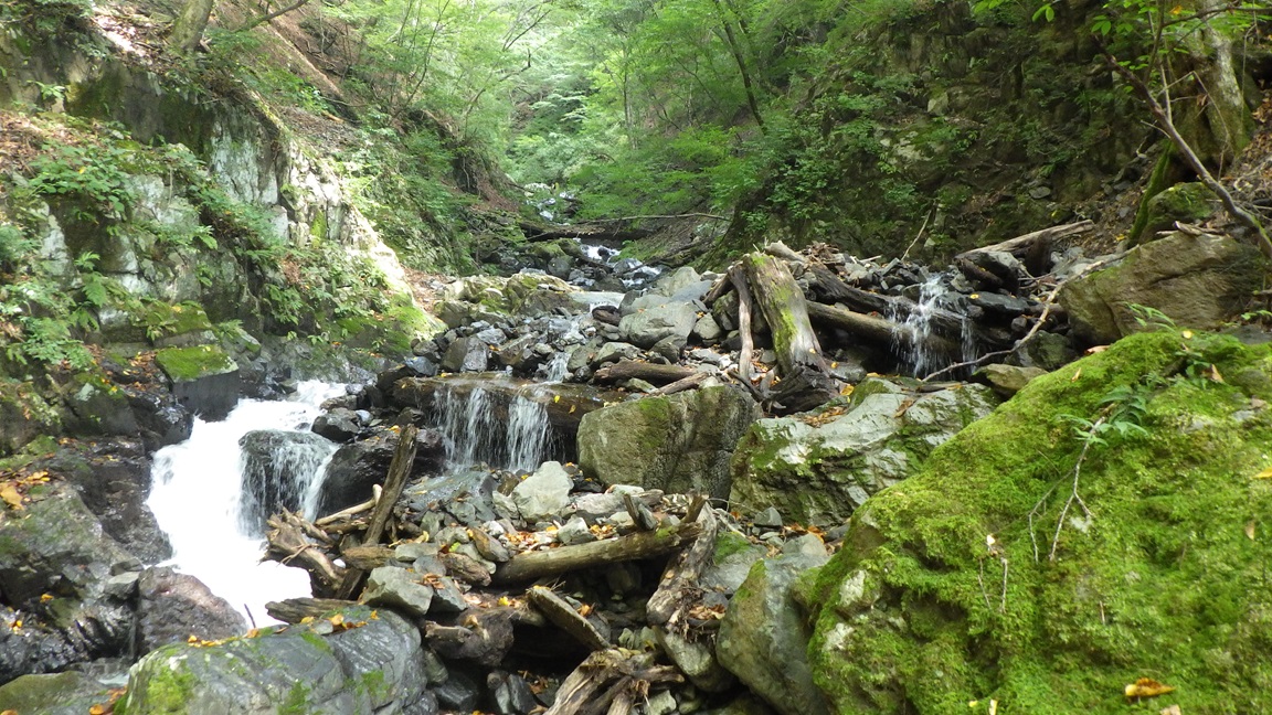 私の車は四駆で最低地上高が20cmあり比較的高いほうだが、 林道はかなり荒れていて、底面や側面に何か当たっていた。 林道終点は広いスペースがある。 ワサビ田の作業や、渓流釣りを対象とした場所のようだ。 8:00頃出発 連日最高気温が35℃くらいの猛暑が続いた後、 台風の影響の雨が数日降った。 奥多摩のこの辺りは気温25℃くらいで涼しかった。 |