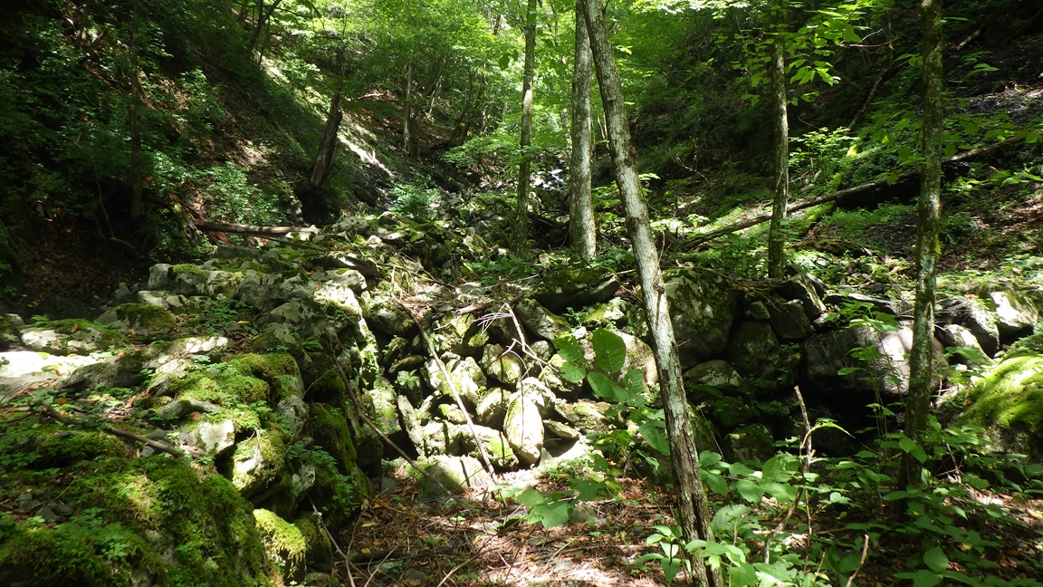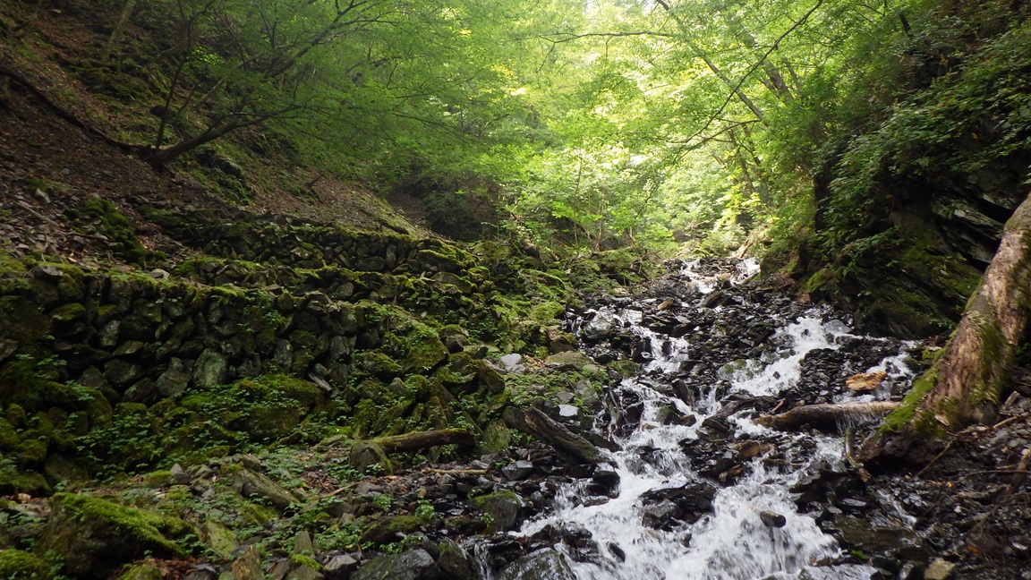 左股は傾斜の緩い、ガレ状の沢だが、ワサビ田の跡と思われる 石積みがあった。 この先の二股地形で水の枯れている左へ進み、 左横の尾根にあがった。 |