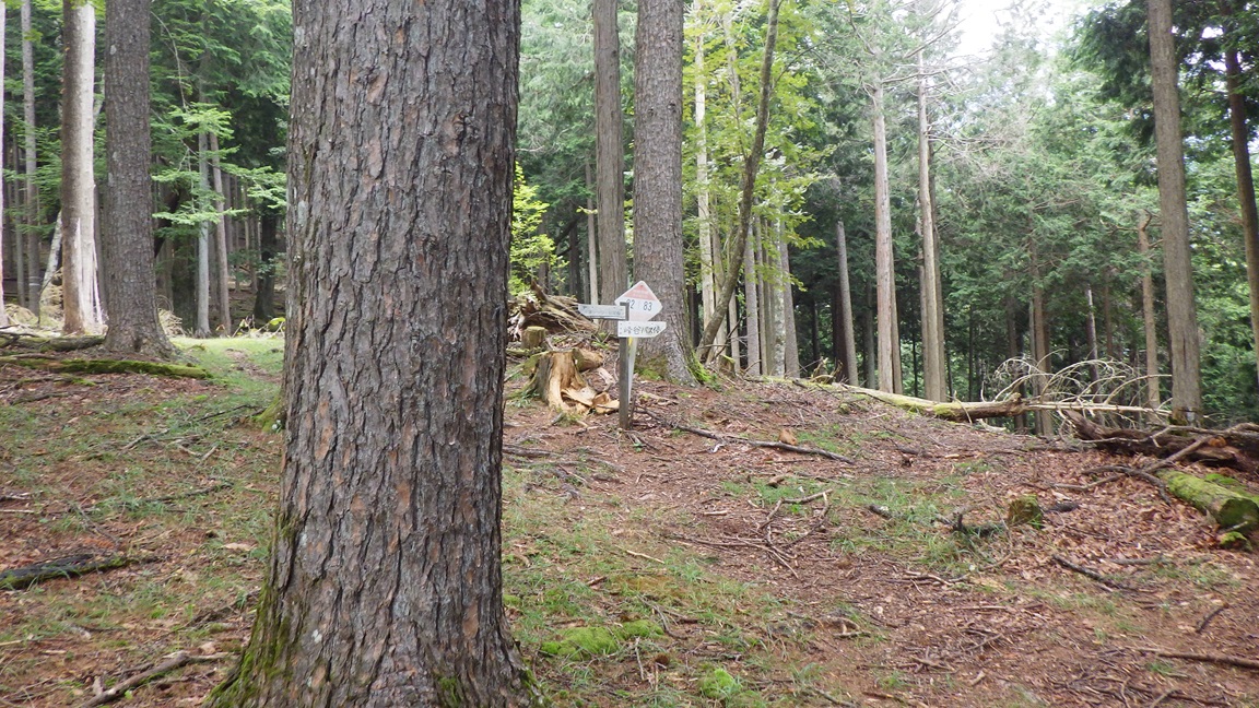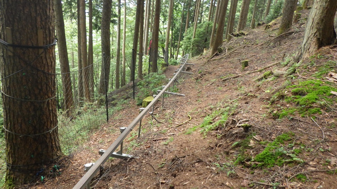 モノレールのレールを跨いで100m弱のところに登山道が有った。 12:40 写真は登山道にでてから振り返って撮ったもので、 「峰谷バス停」と「千本ツツジ・石尾根」と書かれた看板があった。 少し降りて1350mあたりで平らになったところから 左側にみえていたモノレールへまた近づき、レール沿いにおりた。 さすがに暑くなって長袖シャツをぬぎ、半袖Tシャツになった。 |