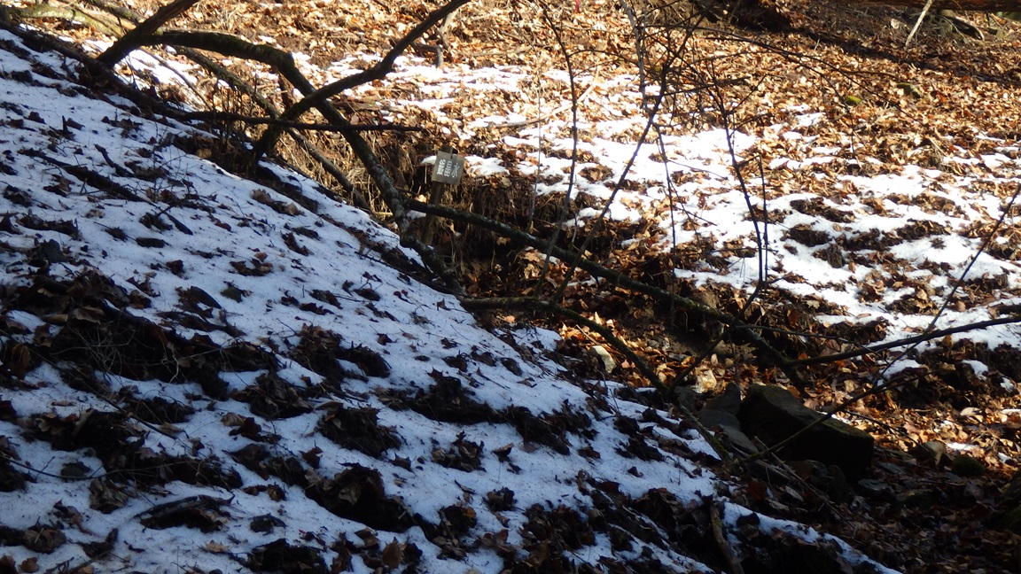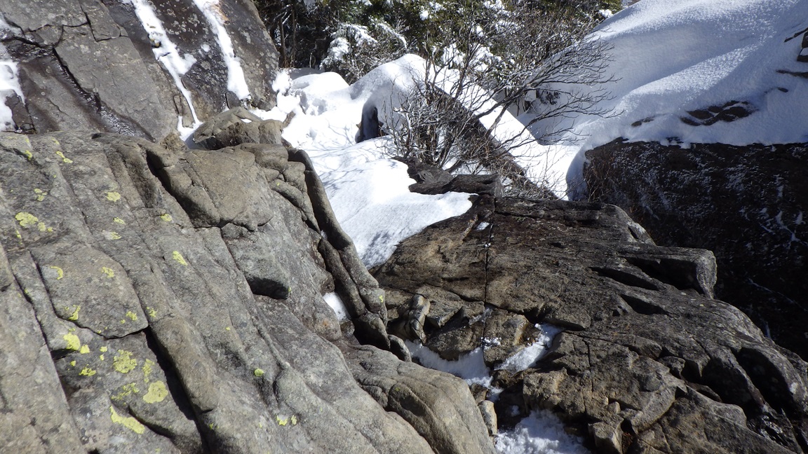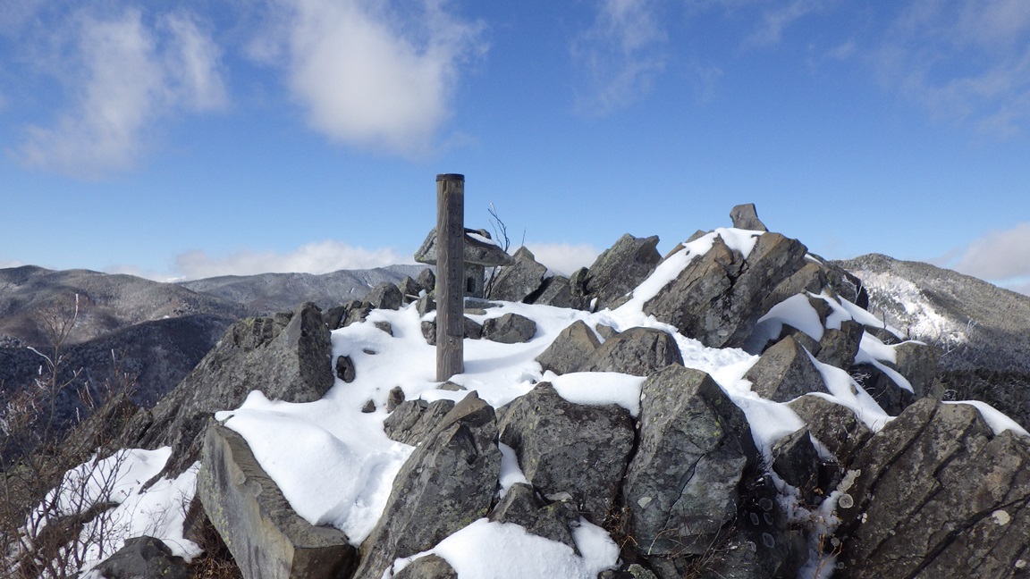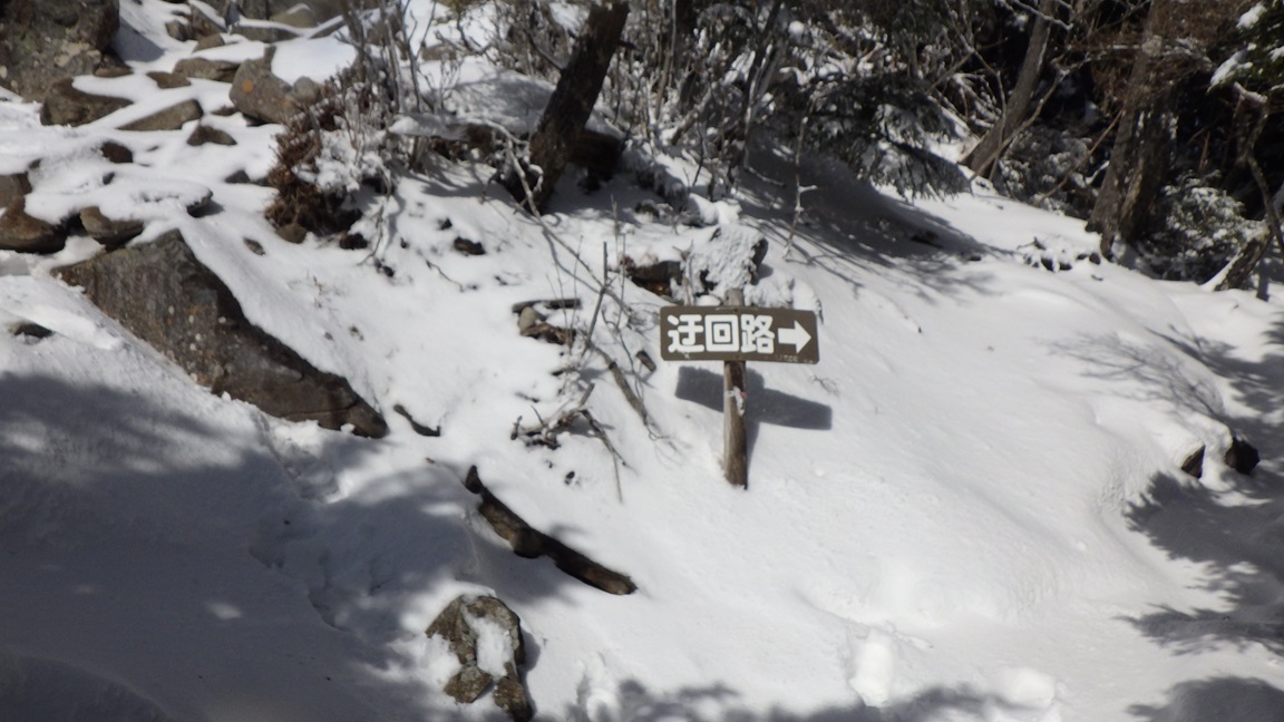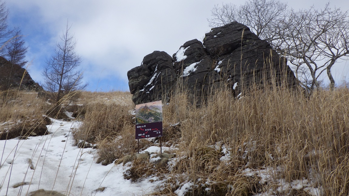 月見岩(1700m) 11:15 ここから新しい靴跡が現れた。 道満尾根の方から登った人だろうと思った。 その人が降りてくるときに会うだろうと思っていたら 会わなかった。 下りは別のルートをとったようだ。 帰りに国師ヶ原を通った時に靴跡が増えていたので、 ここから降りたのだろうと思った。 |