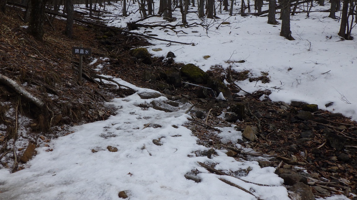 10:00 錦晶水(1530m)は流れていた。 このあたりから登山道に雪が出てきた。 |