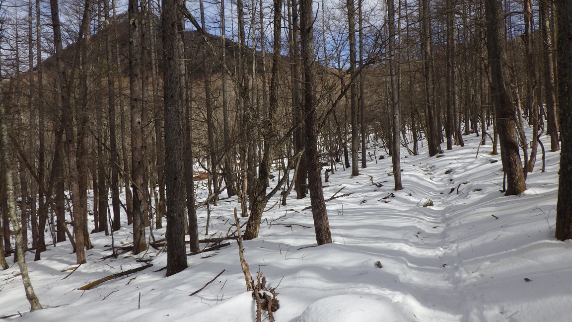 樹林帯の中をジグザグに登っていく。 途中、廃道となった林道と数か所交差する。 銀晶水(1200m)は枯れていた。 |
