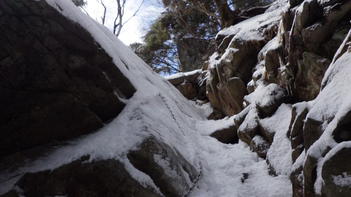 鎖が設置されたところが何か所かある。 途中でストックを1本デポし、さらにもう一本をザックにこていして ピッケルを持った。 |