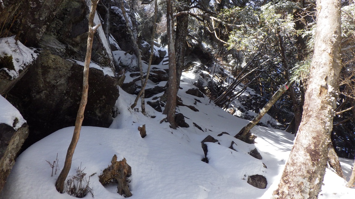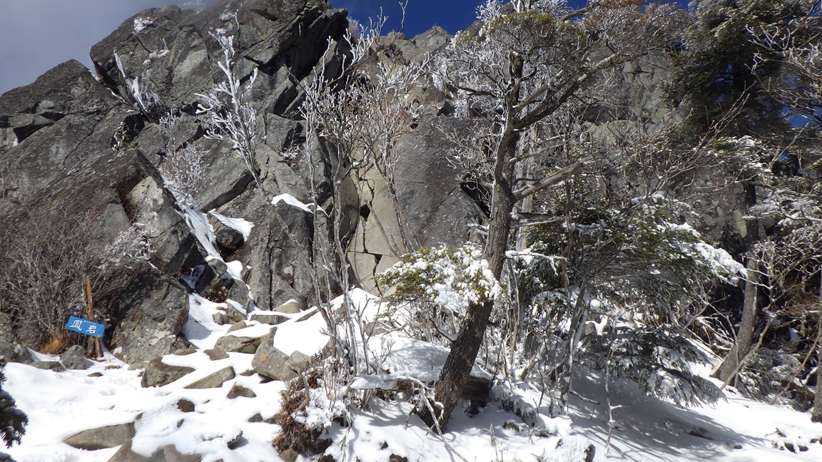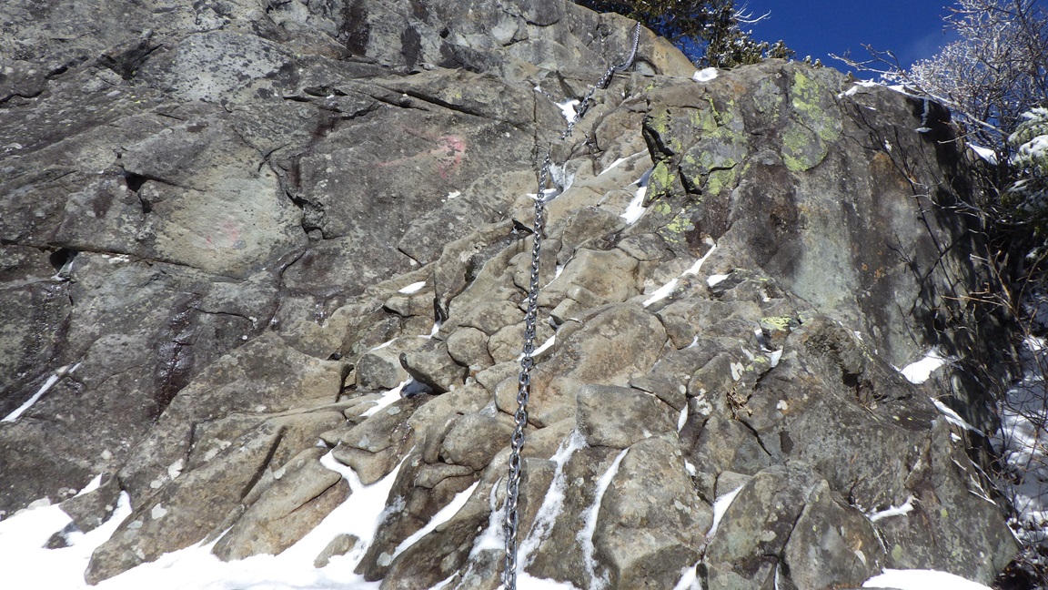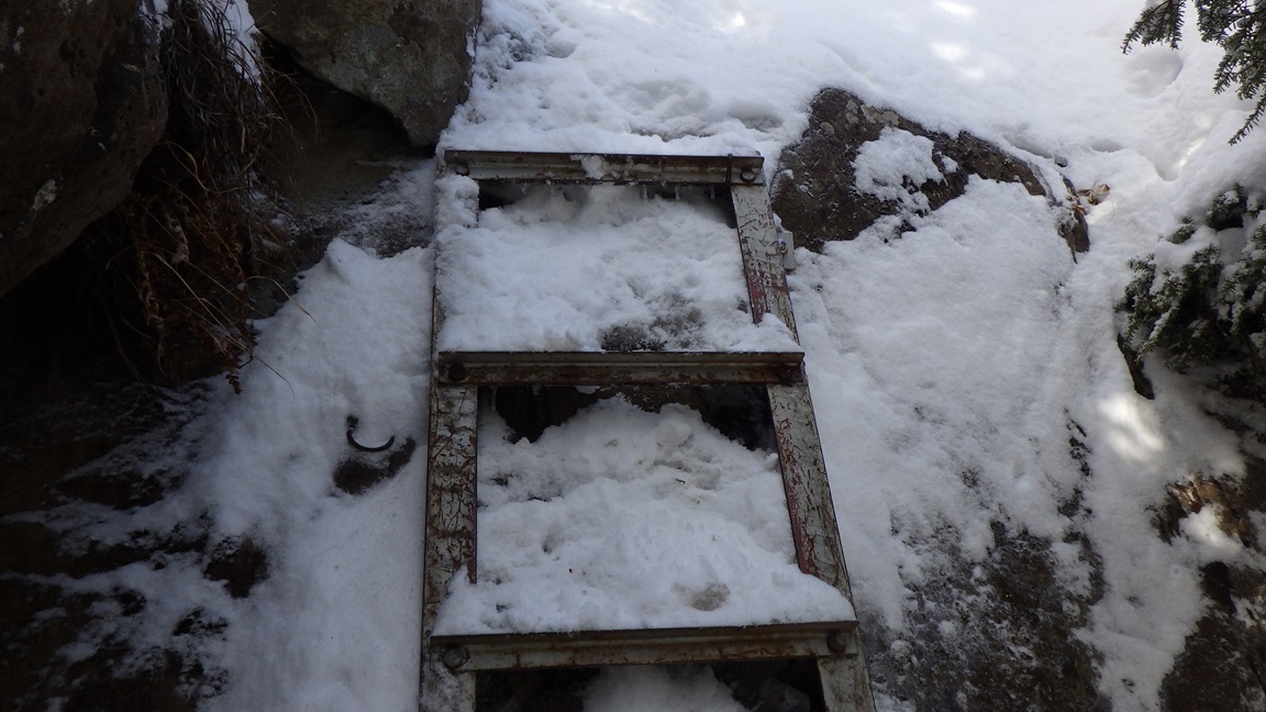 この梯子の氷もピッケルでくだいてみたが、 作業をする足場や手がかりがなく、これ以上登れないと思った。 鳳岩は鎖を握るのに手袋をしていたのでは滑るので 手袋を外したほうがよいが、冷たいだろうと思ったのが 迂回路へ行った理由だ。 実際には素手で鎖を握っても冷たくなかったし、岩も暖かかった。 ひなたで暖められたようだった。 |