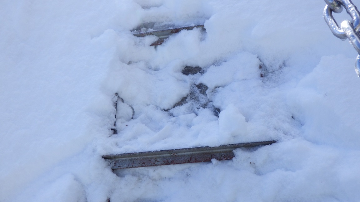 近寄ってみると梯子は氷に固められて足の置き場がない。 ピッケルで氷を砕いて何とか足を乗せられるようにして 登ってみると、その上にも雪と氷に埋もれた梯子があった。 |