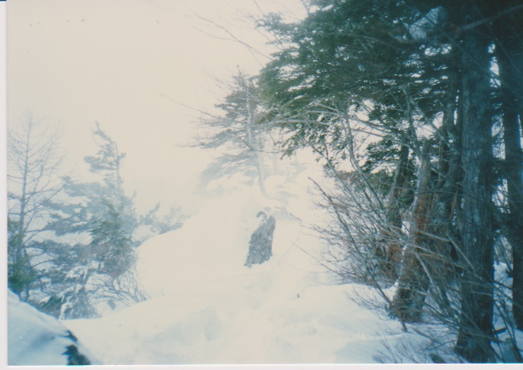 [8合目から9合目へ向かう先行パーティ] 2日目の朝も風が強く雪も大分積もっており出発がためらわれたが、 まわりのテントからは明るい声が聞こえて来ており、行ってみようという気持ちになった。 7時頃出発。雪が深くゆっくり進んでいたら、すぐに後続のパーティに追いつかれ追い越された。 おかげでラッセルの苦労が軽くなった。 7丈小屋までも結構時間がかかった。9時半頃だったか。 8合ご来迎場までの斜面は風が強かった。 その先、先行パーティがゆっくりラッセルしながら進んでおり、 12時半頃2700m地点で前をラッセルしていたパーティーも頂上を断念したので 私も退却を決心した。 |