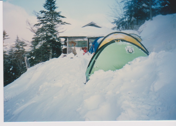 途中でビバークしようかと思ったが、5合目まで行くという単独の人と4人のパーティーを 追い抜いたので5合目まで行くことにした。 ヘッドライトを点けて歩き、5合目小屋前にたどり着いたのは もうすっかり日が落ちた18時ころだった。 小屋の中は既にテントがいくつも張ってあり全く隙間がなく、 小屋の外も平地が少ないため、暗がりの中、雪の斜面を削ってテントを張った。 −12℃ 夕食はラーメンと餅 夜は風が強く台風なみだった。 大揺れのテントの中で、ズボンの穴を繕う裁縫をしていたのが記憶に残っている。 テントはつぶれそうでつぶれなかった 夜中風が強くて殆ど眠れなかった。 写真は朝日のあたる七合目方面 |