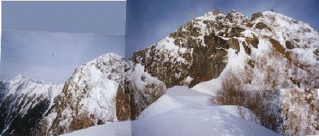 雪はしまていて歩きやすかった。6時30分8合目着。上の写真の地点。ここまでは比較的順調に登れたが、この先また岩場になり、全くトレースが無く気後れがしたのと、1日で下山できる自信もなかったので頂上はあきらめることにした。