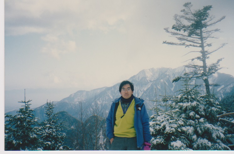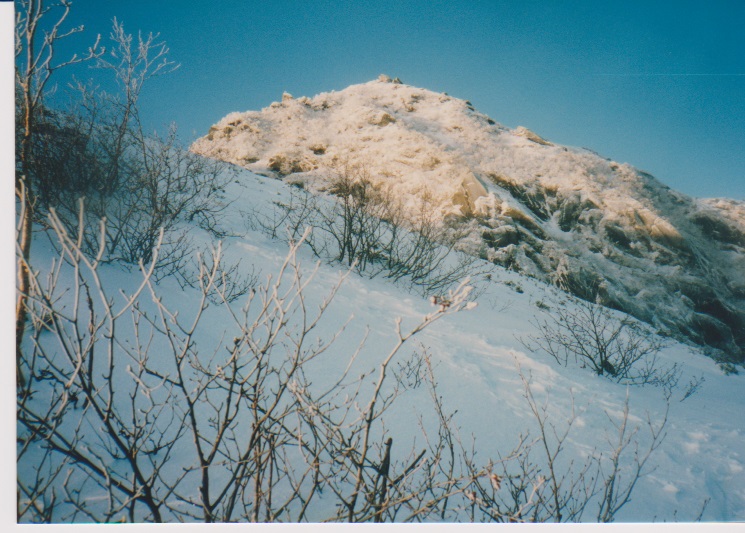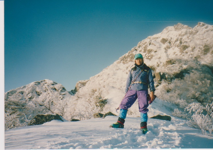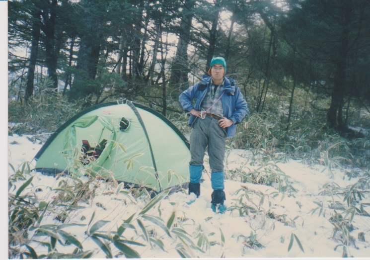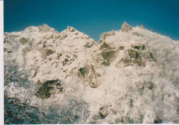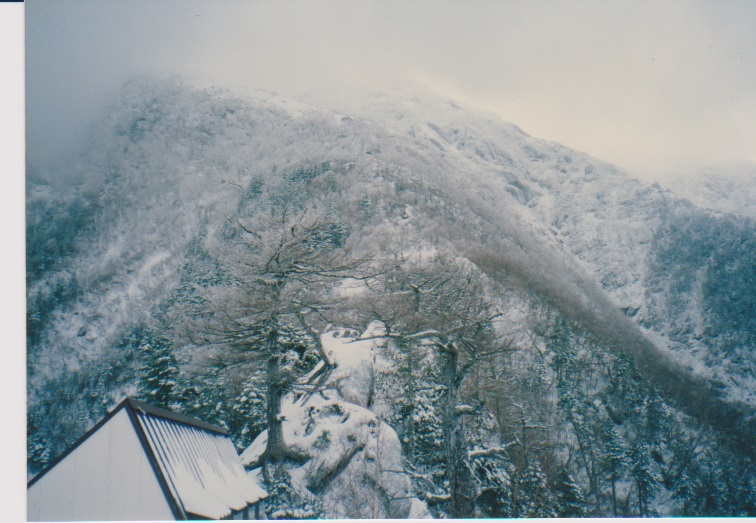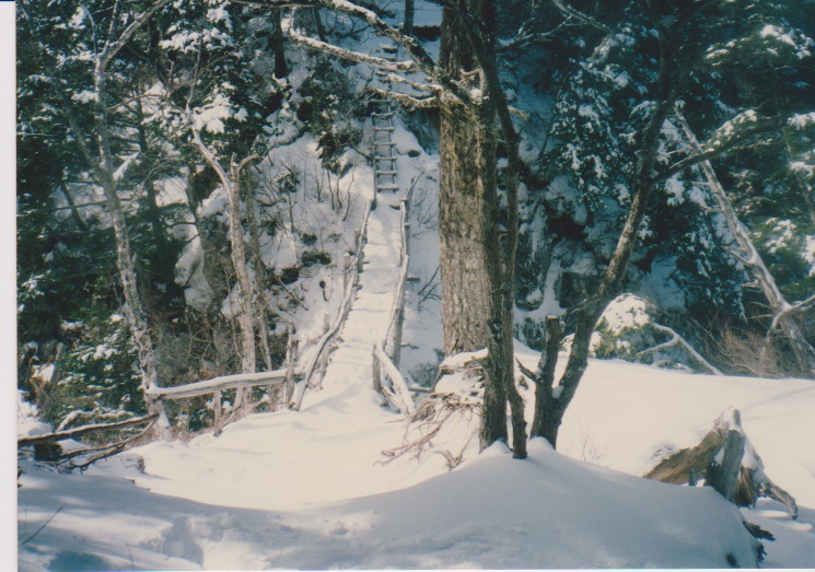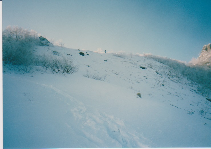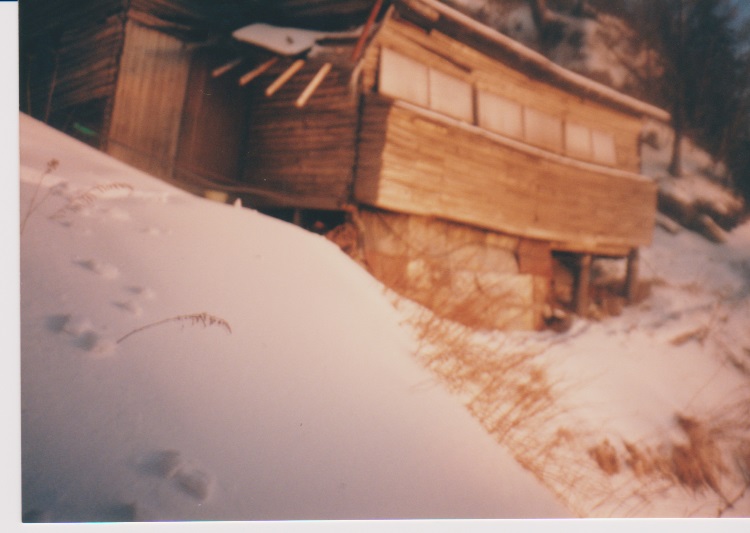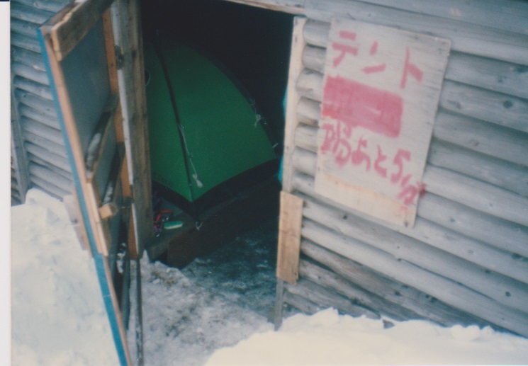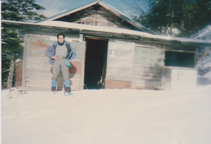 12月29日 5時起床。 朝、餅4個、紅茶 7:15発 刃渡りまで1時間くらいかかり、9:45 5合目着。 そこでカロリーメイトを食べ 10時発。日差しがまぶしい。 (五合目小屋も当時はしっかり立っていた) |