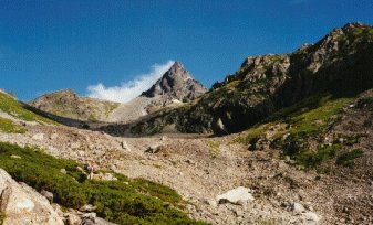 ここから雨が降りだし、かなりの降りになった。ザイテングラードを過ぎてから傘をさした。涸沢では雨の中でテントを張ったがじき晴れた。