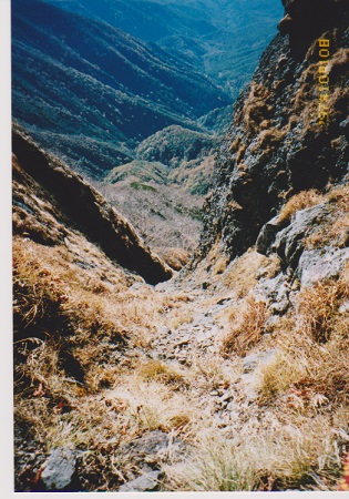 中岳道を行者小屋に向かっておりた。ここは斜面をトラバース気味につけられた道なので積雪期は通れない。