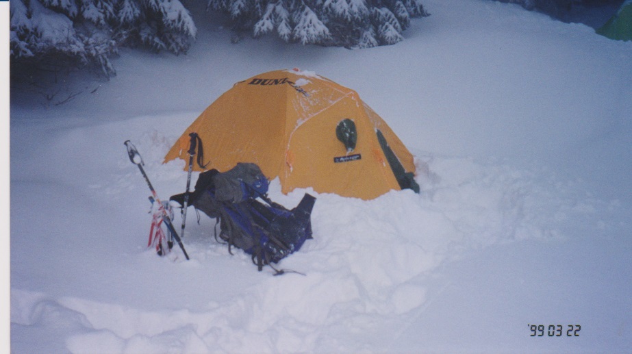 雪は夜中降り続いた。テントの上にもかなり積もり、横から押しつぶされる感じで、時々内側からけっ飛ばしたりたたいたりした。
